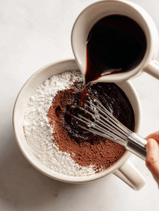 4. Gradually pour the wet mixture into the dry ingredients, gently mixing with an electric mixer on low speed until just combined. The batter should be smooth, dark, and slightly glossy.