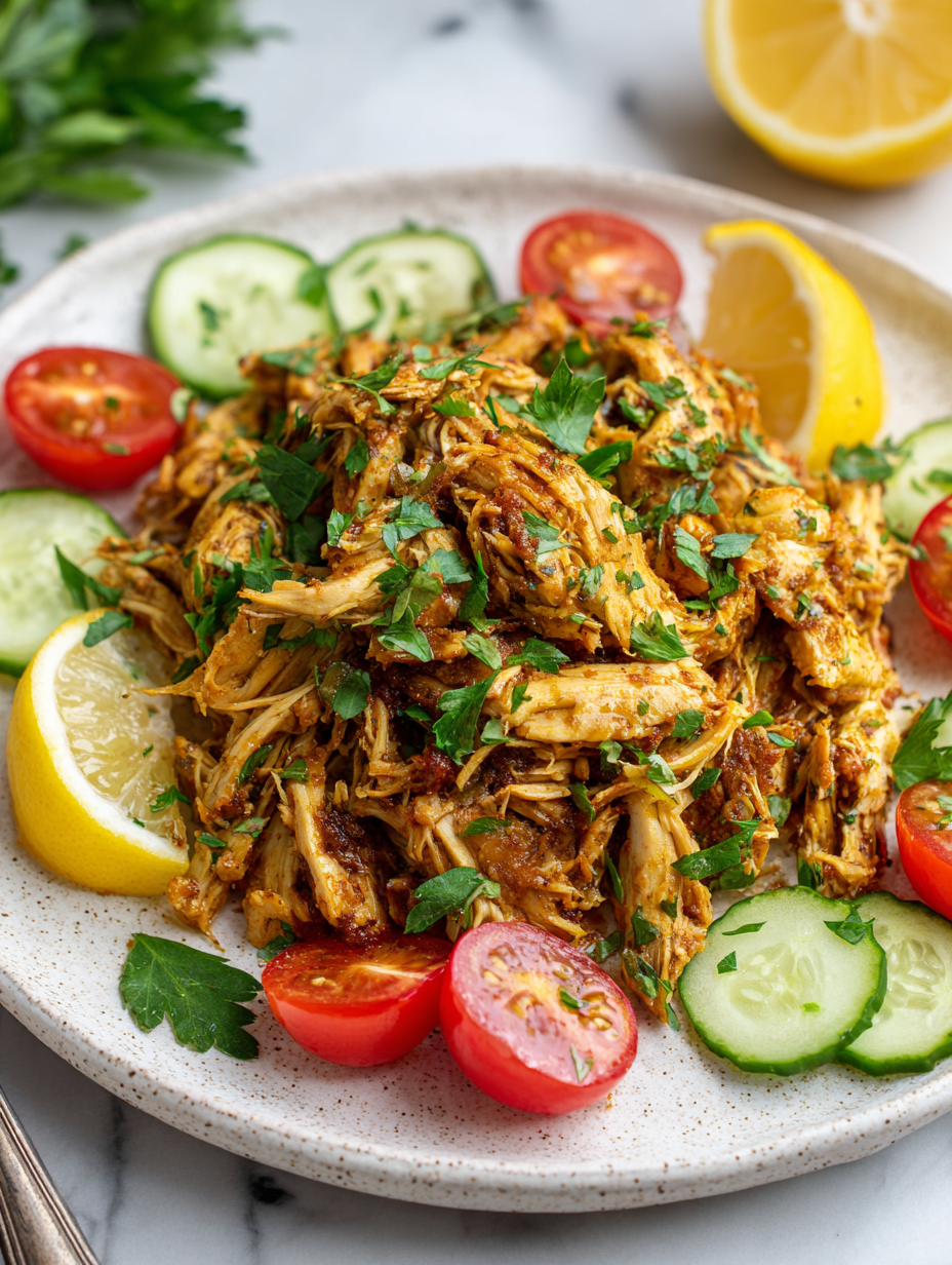 Once shredded, transfer the chicken to a serving dish. Garnish with fresh herbs like parsley or cilantro. Serve immediately with pita, rice, or atop salads. If making ahead, store in an airtight container in the fridge for up to 3 days; reheat gently, checking for steam and aroma renewal.