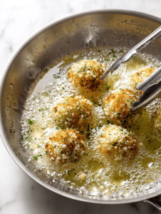 - Carefully place the meatballs into the hot oil, turning occasionally with tongs or a spatula, and cook for about 5 minutes until they develop a golden brown, crispy exterior.