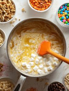 Step 3: Add marshmallows and stir constantly until they melt completely, about 3-4 minutes; the mixture should be smooth and oozy.