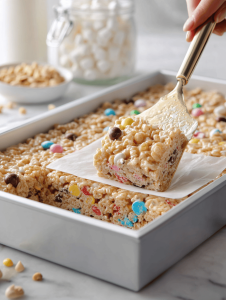 Step 5: Press the mixture into a greased 9×13-inch pan using a buttered spatula or wax paper. Don’t pack it too tight—keep it a little loose for chewiness.
