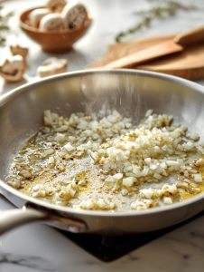 Step 3: In a large skillet, sauté 1 diced onion and 2 minced garlic cloves in a splash of oil until translucent and fragrant.
