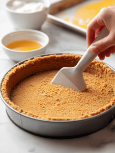 Step 3: Mix crushed graham crackers, melted butter, and a pinch of salt for the crust. Press into the pan.