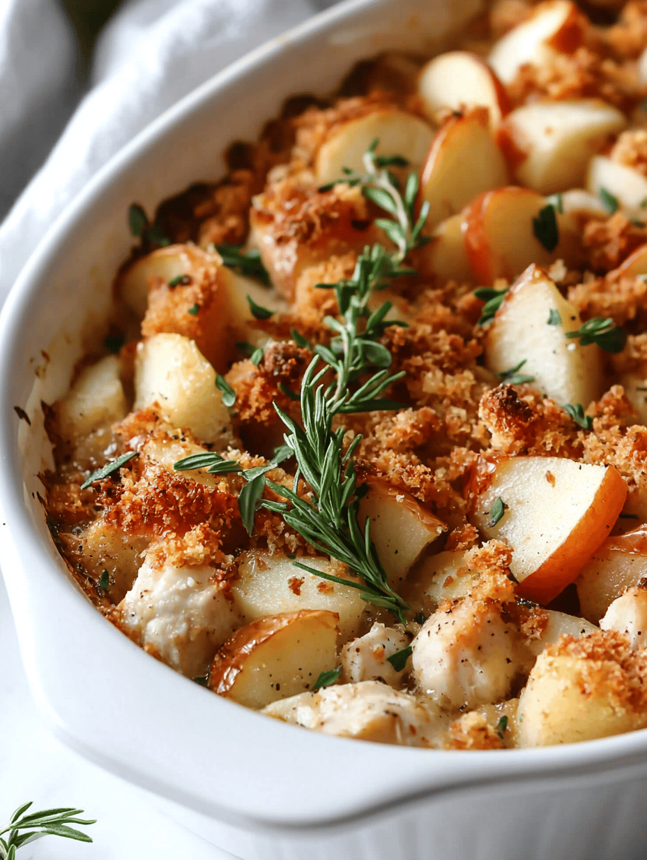 This casserole combines tender chicken pieces with sweet apples and nutty spices, baked until bubbling and golden. The dish showcases a hearty, layered texture with a comforting aroma, featuring a mix of crispy topping and juicy filling. It uses roasting, sautéing, and baking methods to create a visually appealing, rustic final presentation.