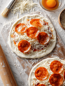 6. Spread some grated mozzarella and pepperoni slices over half of each dough circle, leaving a small border around the edge.