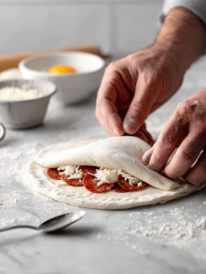 7. Fold the dough over the filling to create a half-moon shape. Pinch the edges tightly to seal, ensuring no filling escapes during baking.