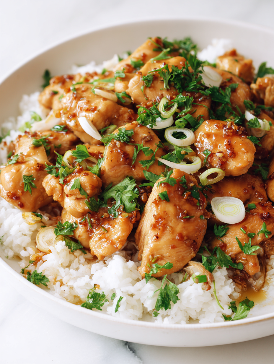 - Serve hot: plate the chicken with rice or steamed veggies, spoon extra glaze over, and garnish with sliced green onions or sesame seeds if desired.
