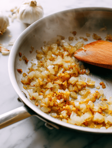 Step 3: In a large skillet, sauté chopped onions and garlic until fragrant, about 5 minutes.