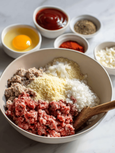 Step 2: In a large mixing bowl, combine 1 pound ground beef, ½ pound ground pork, and 1 cup finely chopped onions.