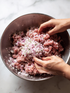 2. Combine the ground beef, ground pork, and chopped onions in a large mixing bowl. Use your hands to break up the meat and evenly distribute the onions, creating a fragrant, slightly sticky mixture.
