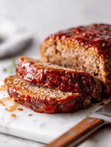 8. Slice the meatloaf into thick pieces, revealing a juicy, tender interior with a beautifully caramelized crust. Serve hot, garnished with your favorite sides or extra ketchup if desired.