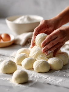Step 4: Divide dough into small portions, roll into balls, and shape into pretzel bites.