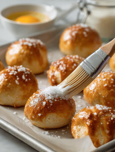 - Brush each pretzel bite with beaten egg and sprinkle generously with coarse sea salt for a glossy, salty crust.