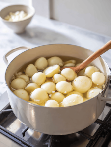 - While the potatoes cook, heat a splash of oil in a skillet and sauté diced onion and minced garlic until fragrant and translucent, about 3-4 minutes.