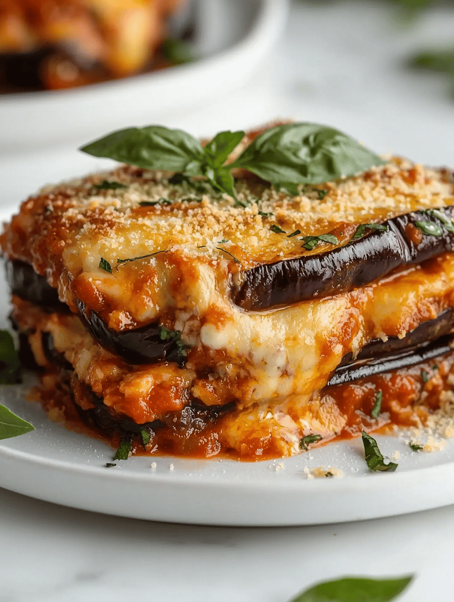 This eggplant Parmesan features tender, breaded eggplant slices layered with a rich, savory tomato sauce and melted cheese. The dish is baked until golden and bubbling, showcasing a combination of crispy textures and gooey cheese with a vibrant, hearty appearance.