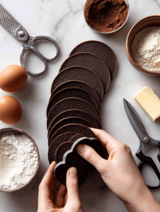 - Cut each chocolate wafer or cookie into a small brim shape with a cookie cutter or round cutter.